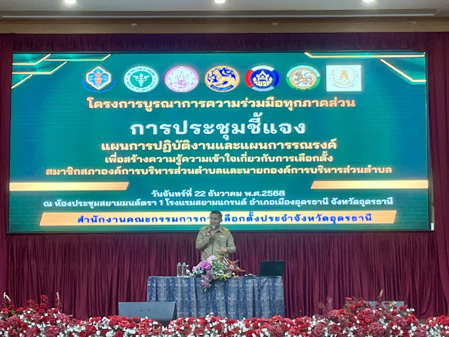 วันจันทร์ที่ 22 ธันวาคม 2568  เวลา  9.00 น   นายสาจิต  จันทรศิริ ท้องถิ่นจังหวัด   พร้อมด้วยท้องถิ่นอำเภอ สำนักงานส่งเสริมการปกครองท้องถิ่นอุดรธานี  ร่วมประชุมสัมมนา บูรณาการความร่วมมือของทุกภาคส่วน ชี้แจงแผนการปฏิบัติงานและแผนการรณรงค์เพื่อสร้างความรู้ความเข้าใจเกี่ยวกับการเลือกตั้งสมาชิกสภาองค์การบริหารส่วนตำบลและนายกองค์การบริหารส่วนตำบล  จัดโดย สำนักงานคณะกรรมการเลือกตั้งประจำจังหวัด ณ ห้องสยามมนต์ตรา 1 โรงแรมสยามแกรนด์ ต.หนองขอนกว้าง อ.เมือง และมี  นายพิสิษฐ์ชัย อภัยปิยกุล รองผู้ว่าราชการจังหวัดอุดรธานี เป็นประธาน