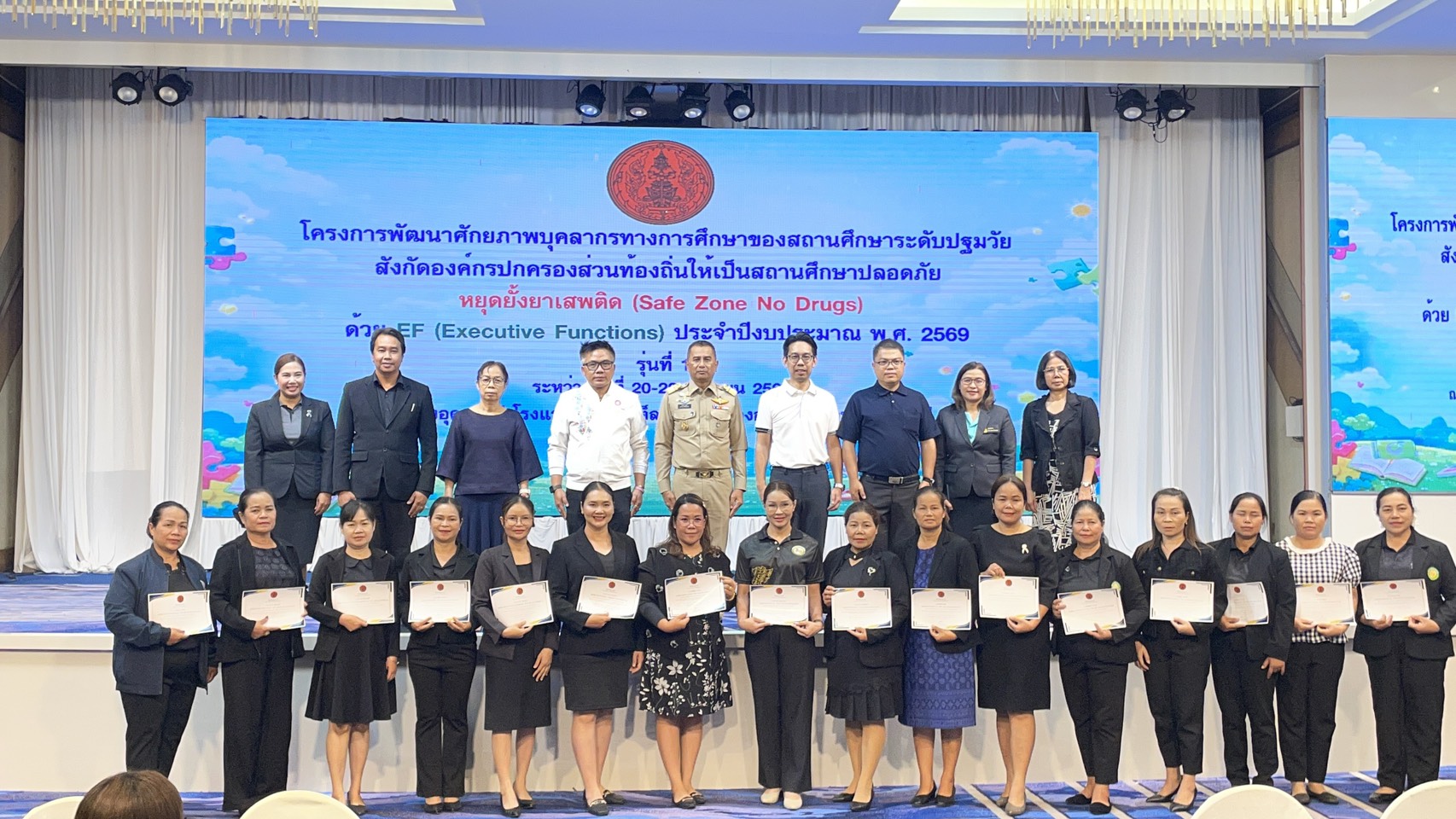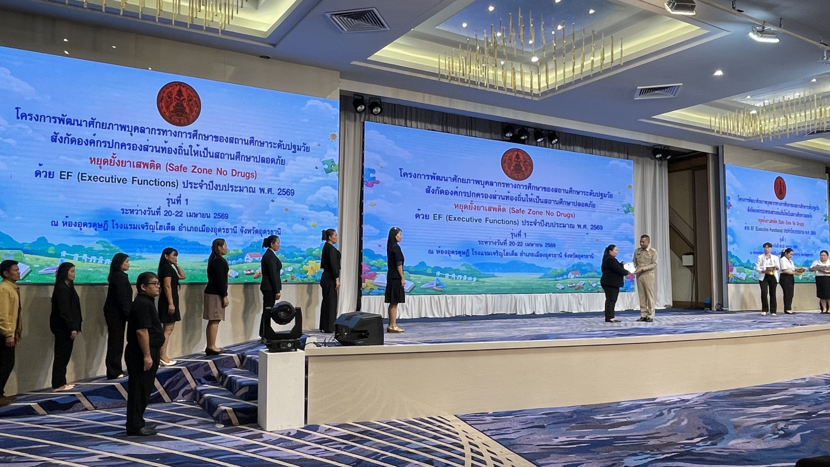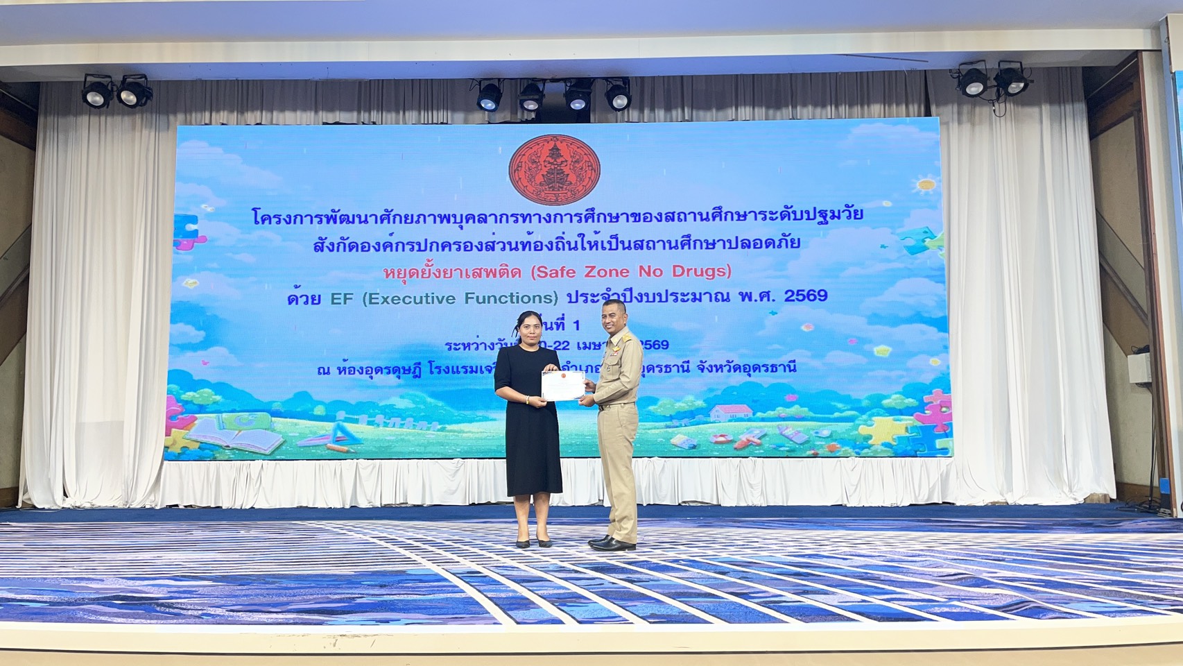 วันพุธที่ 22 เมษายน  2569 เวลา 15.00 น  นายสาจิต จันทรศิริ ท้องถิ่นจังหวัด พร้อมด้วย ผอ.กลุ่มงาน และ บุคลากร สำนักงานท้องถิ่นจังหวัด อุุดรธานี ร่วมพิธี ปิดโครงการ พัฒนาศักยภาพ บุคลากรทางการศึกษาของสถานศึกษาระดับปฐมวัย สังกัดองค์กรปกครองส่วนท้องถิ่น ให้เป็นสถานศึกษาปลอดภัย หยุดยั้งยาเสพติด (Safe Zone No Drugs) ด้วย EF (Excutive Functions) ประจําปีงบประมาณ 2569 รุ่นที่ 1 ณ. ห้องอุดรดุษฏี โรงแรมเจริญโฮเต็ล โดยมี นายราชันย์ ซุ้นหั้ว ผู้ว่าราชการจังหวัด ให้เกียรติเป็นประธาน มอบ ประกาศนียบัตร
